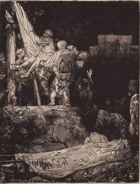 Uno de los mejores ejemplos es El entierro de Jesús. En ella, Rembrandt presta especial atención al color. A partir del segundo estado, cubre toda la plancha con una finísima trama de líneas pero, para lograr representar con mayor libertad, variedad y más fácilmente la oscuridad casi total de la cueva, deja sobre la plancha una capa de tinta que, según cómo la limpie, produce una imagen diferente al estampar cada prueba. Todas son impresionantes; todas logran transmitir una terrible sensación de tristeza y silencio. El negro es tan intenso que, en la mayoría de los casos, sólo gracias al leve resplandor que emana del cuerpo muerto de Jesús se pueden vislumbrar las figuras que le rodean, un resplandor que se va apagando poco a poco. Rembrandt ha logrado plasmar sobre un papel de pequeño tamaño, en blanco y negro, todo el dolor del mundo: por eso se le considera un genio.